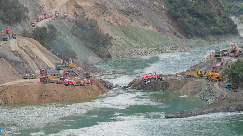 10月28日,自卸卡車(chē)協(xié)同作業(yè)將成噸石料拋投進(jìn)牙根一級(jí)水電站主龍口位置。(雅礱江流域水電開(kāi)發(fā)有限公司供圖)