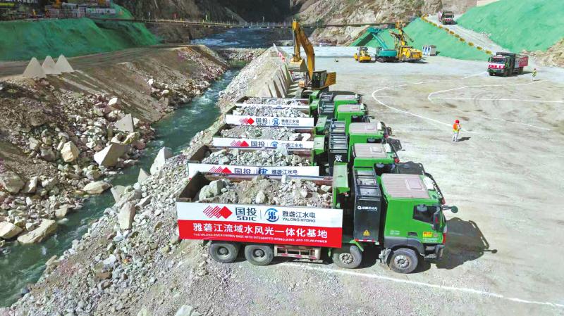 在雅礱江孟底溝水電站截流現(xiàn)場,多輛新能源自卸車不間斷地運輸石料。(圖片由雅礱江流域水電開發(fā)有限公司提供)
