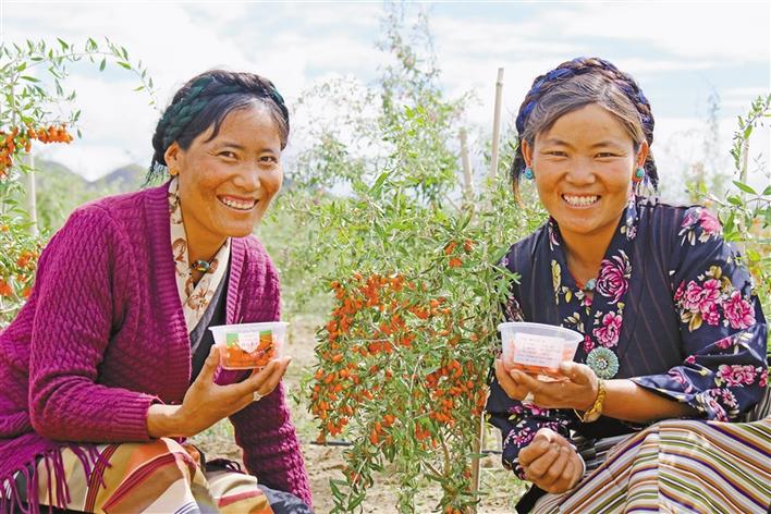 圖為當(dāng)?shù)厝罕娬谡故驹谌湛t市白朗縣嘎東鎮(zhèn)枸杞產(chǎn)業(yè)園區(qū)配套水保綜合項(xiàng)目內(nèi)收獲的枸杞。