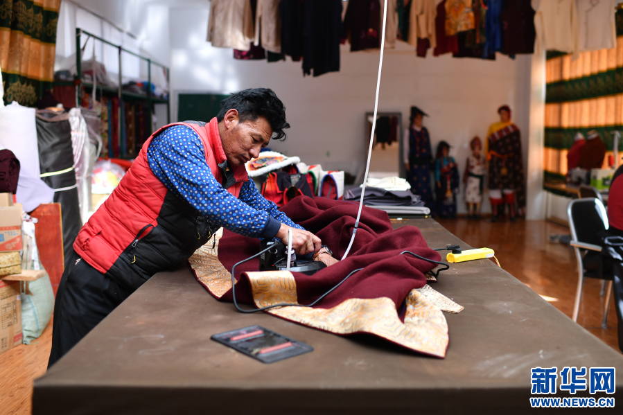 在西藏昌都市江達(dá)縣格桑花民族服飾加工銷售公司,江達(dá)縣字嘎鄉(xiāng)塔字村村民扎西江措在制作藏裝(4月30日攝)。扎西江措學(xué)習(xí)制作藏裝不到兩年時(shí)間,已經(jīng)是一名熟練的制衣工,現(xiàn)在每個(gè)月有4000多元的收入。新華社記者詹彥 攝