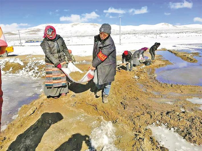 駐村期間,羅布頓珠(左二)同村民一起對(duì)嚴(yán)重影響農(nóng)牧民生產(chǎn)生活的滲水口進(jìn)行了堵截。 中國(guó)電信西藏公司供圖