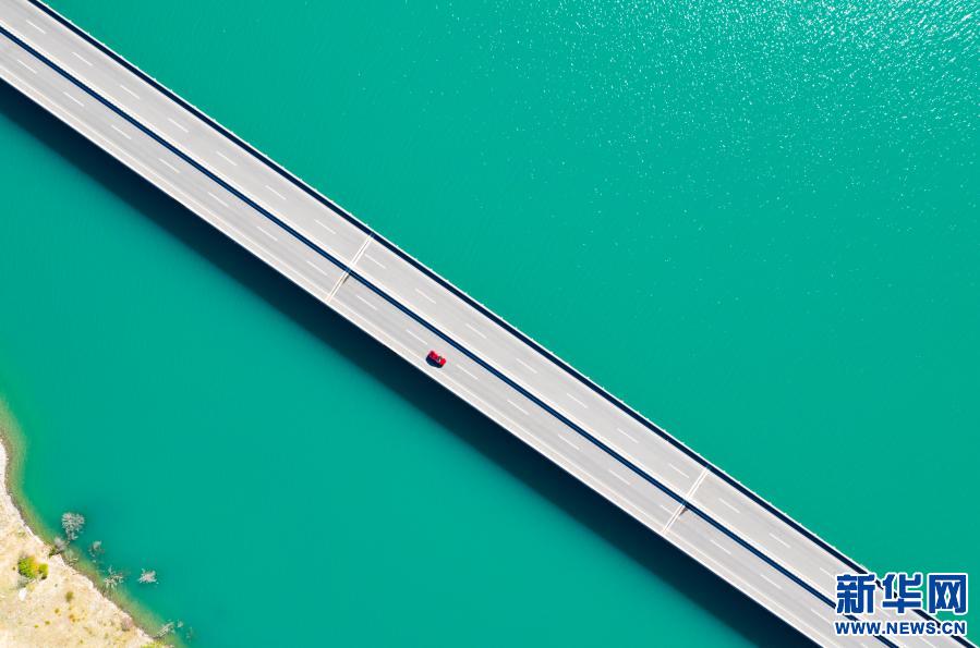 2019年10月28日,一輛汽車經(jīng)過林芝境內(nèi)的多布特大橋(無人機(jī)拍攝)。新華社記者 普布扎西 攝