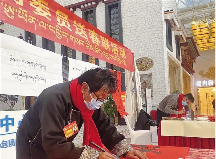 “這次我和各位書法家集聚于此,為委員們題寫春聯(lián)和書法作品,深感榮幸,這不僅進一步弘揚了傳統(tǒng)文化,更為大家送上了新春祝福,表達了美好的新年愿景,也希望我們書寫的作品通過各位委員傳遞到廣大群眾中,弘揚主旋律、傳遞正能量,切實發(fā)揮文藝激勵人心的作用?!敝袊鴷覅f(xié)會會員、中國美術(shù)家協(xié)會會員、自治區(qū)書法家協(xié)會副主席、拉薩市書法家協(xié)會主席高延鴻說。