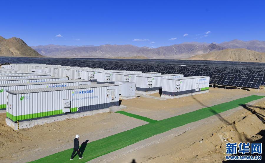 西藏日喀則市江當(dāng)現(xiàn)代生態(tài)產(chǎn)業(yè)示范園內(nèi)的50兆瓦光儲(chǔ)電站儲(chǔ)能系統(tǒng)和太陽(yáng)能光伏組件(2020年12月24日攝)。新華社記者 張汝鋒 攝