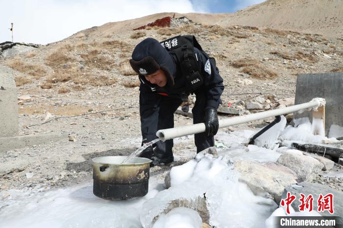 珠峰大本營執(zhí)勤點民警正在取水做飯。彭維熙 攝