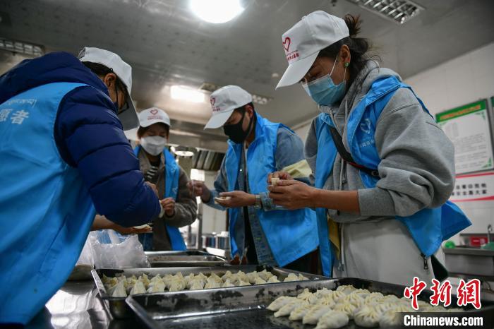 圖為青年志愿者在為福利院老人包餃子?!∝暩聛硭伞z