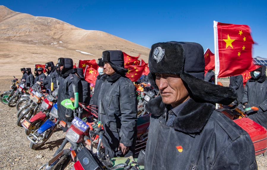 夜幕降臨高原,一天的訓(xùn)練結(jié)束。隊(duì)員們騎著車從鄉(xiāng)里散去,出發(fā)前不忘再緊一緊車尾的國(guó)旗。一輪明月懸在喜馬拉雅山脈的群山上,照亮了守邊人的回家路。