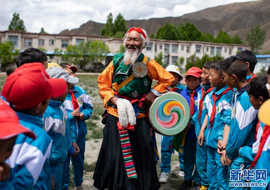 “久河卓舞”傳承人尼瑪(中)在瓊結(jié)縣下水鄉(xiāng)小學(xué)進行教學(xué)表演前的準(zhǔn)備工作(2020年7月2日攝)。新華社記者 普布扎西 攝