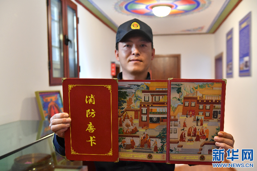 布達(dá)拉宮消防救援大隊(duì)二級(jí)指揮員喬宣茜展示消防救援大隊(duì)推出的消防宣傳唐卡(3月4日攝)。新華社記者 孫瑞博 攝
