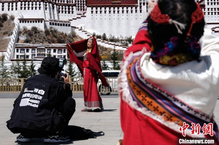 游客在拉薩布達拉宮廣場體驗藏式元素服裝。江飛波 攝