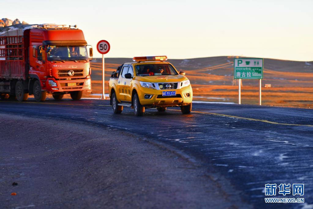安多公路養(yǎng)護段工作人員在國道109唐古拉山口路段巡查(1月13日攝)。新華社記者 張汝鋒 攝