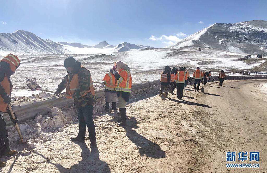 在國道109線K3351路段,安多公路養(yǎng)護段工作人員進行除雪除冰作業(yè)(2020年3月11日攝)。新華社發(fā)(后耀軍 攝)