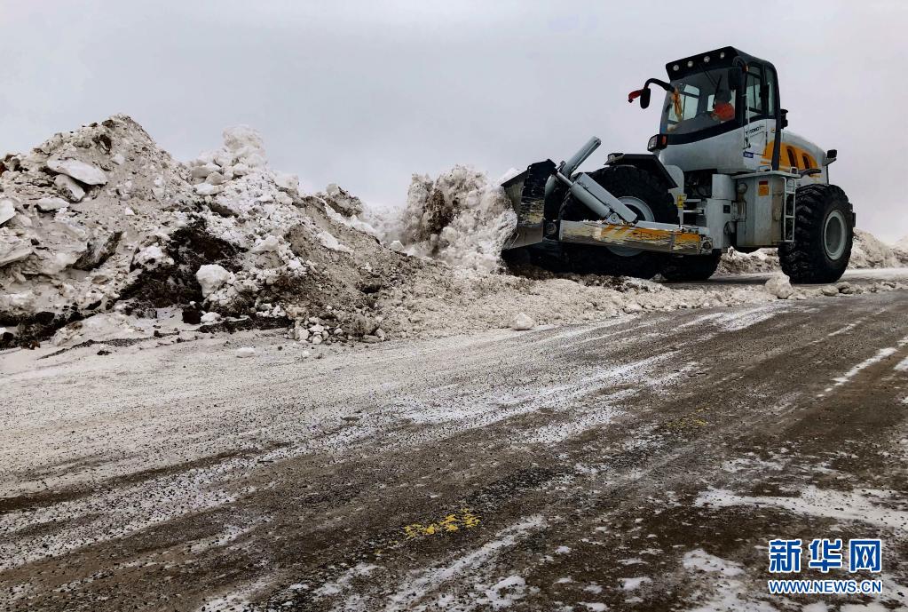 在國道109線K3349路段,安多公路養(yǎng)護段工作人員進行除雪除冰作業(yè)(2019年2月13日攝)。新華社發(fā)(邊巴央吉 攝)