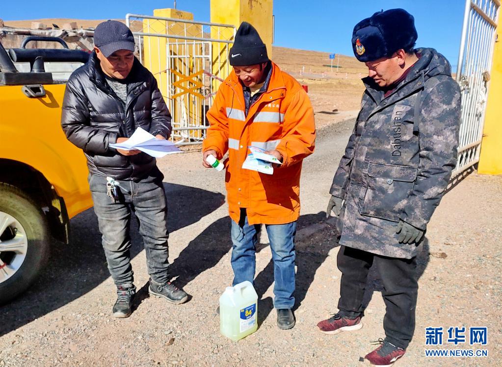 在安多公路養(yǎng)護段家屬院,扎西次仁(左)和同事準(zhǔn)備為工區(qū)工作人員發(fā)放疫情防控物資(2月8日攝)。新華社發(fā)(斯塔卓瑪 攝)