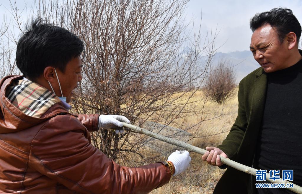 3月30日,索朗羅布(右)給樹裝上“防鼠套”。新華社記者 覺果 攝