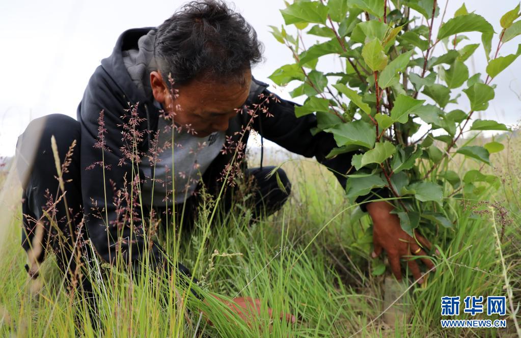索朗羅布在檢查樹的長勢(2020年8月8日攝)。新華社記者 覺果 攝