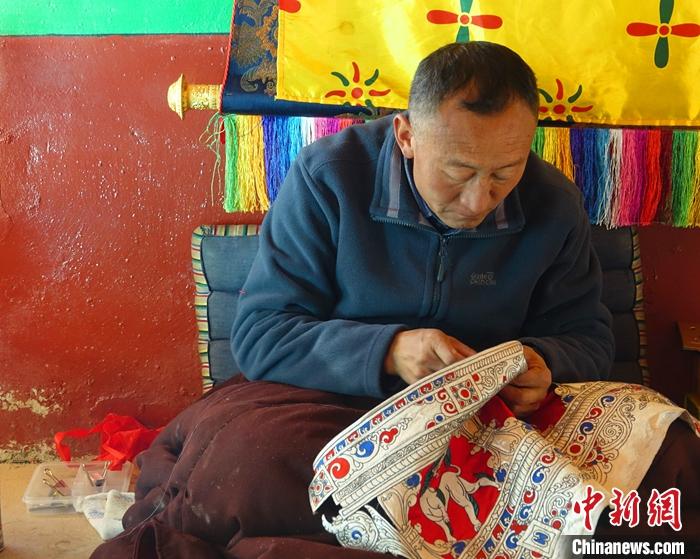 4月5日,拉薩堆繡唐卡技藝傳承人羅布正在進(jìn)行創(chuàng)作。中新社記者 冉文娟 攝