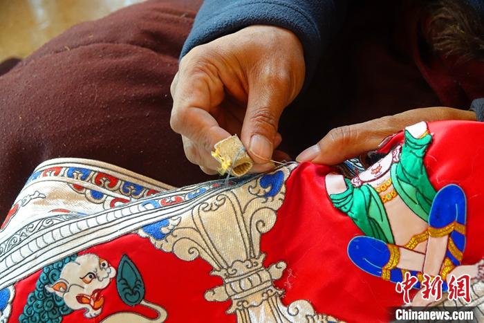 4月5日,記者拍攝的正在創(chuàng)作中的拉薩堆繡唐卡作品。中新社記者 冉文娟 攝