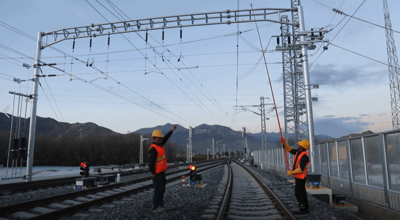 此次接觸網(wǎng)受電,由協(xié)榮站、扎囊站、山南站依次往林芝車站進行,全線共有11座變電所、23個供電臂,整個受電過程歷經(jīng)1小時29分。