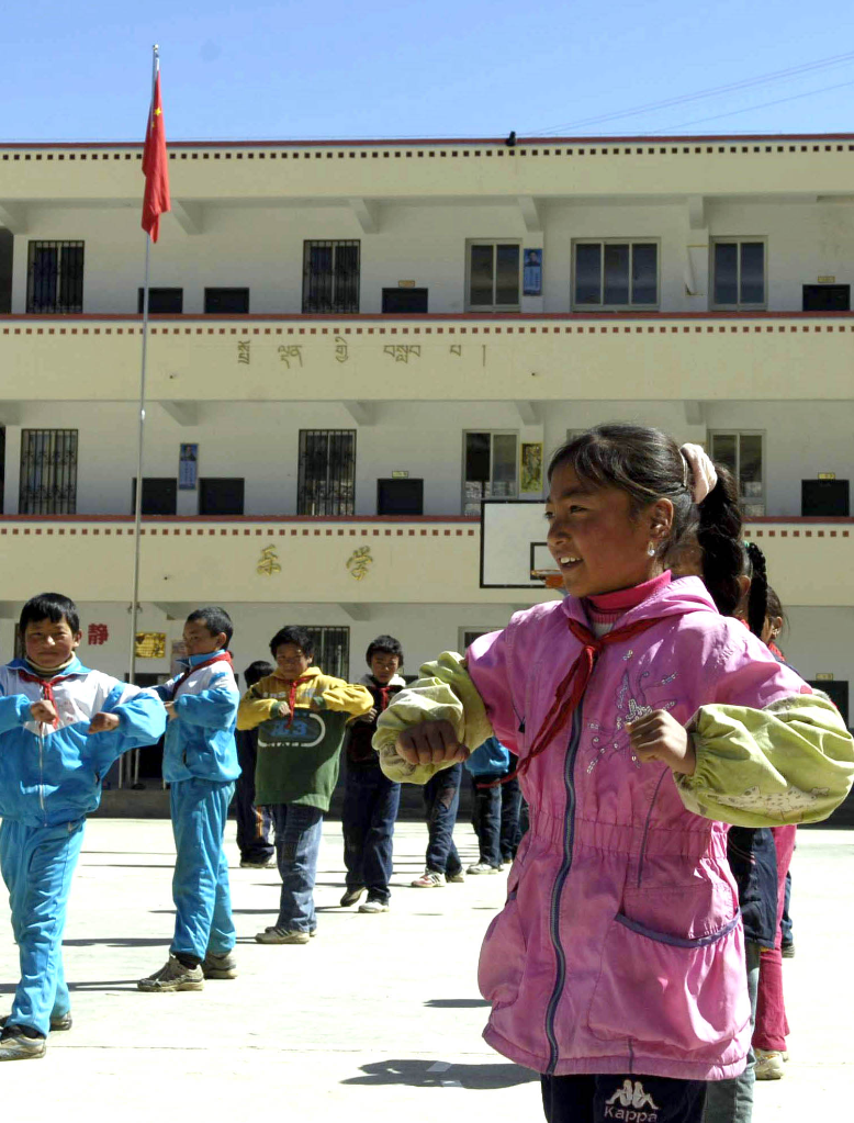 2008年4月16日,四川省阿壩藏族羌族自治州壤塘縣南木達易地育人學(xué)校的學(xué)生在上體育課。 新華社記者海明威 攝