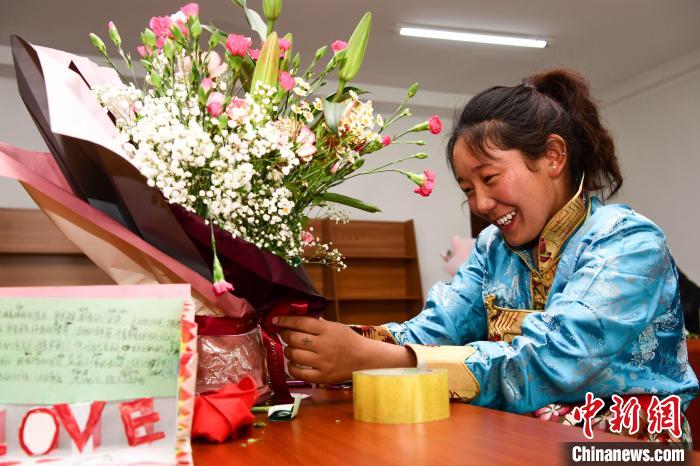 圖為兒童福利院的孩子們給自己的“媽媽”送去擁抱、賀卡。貢嘎來松 攝