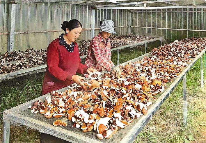 圖為亞登(左)與本村婦女在晾曬靈芝。歐陽(yáng)海燕 攝