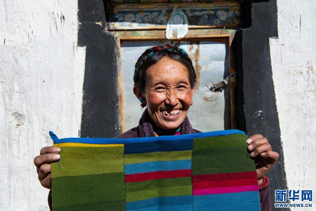 西藏自治區(qū)日喀則市定日縣扎西宗鄉(xiāng)托桑林村曾經(jīng)的建檔立卡貧困戶(hù)格桑展示自己編織的藏族傳統(tǒng)衣物裝飾邦典(2020年1月20日攝)。新華社記者 孫非 攝