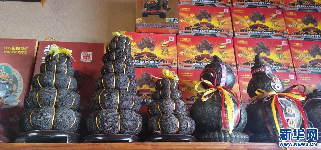 在位于西藏拉薩的一家茶葉公司的門(mén)店內(nèi)擺放著造型獨(dú)特的茶葉制品(4月23日攝)。新華社記者 張京品 攝