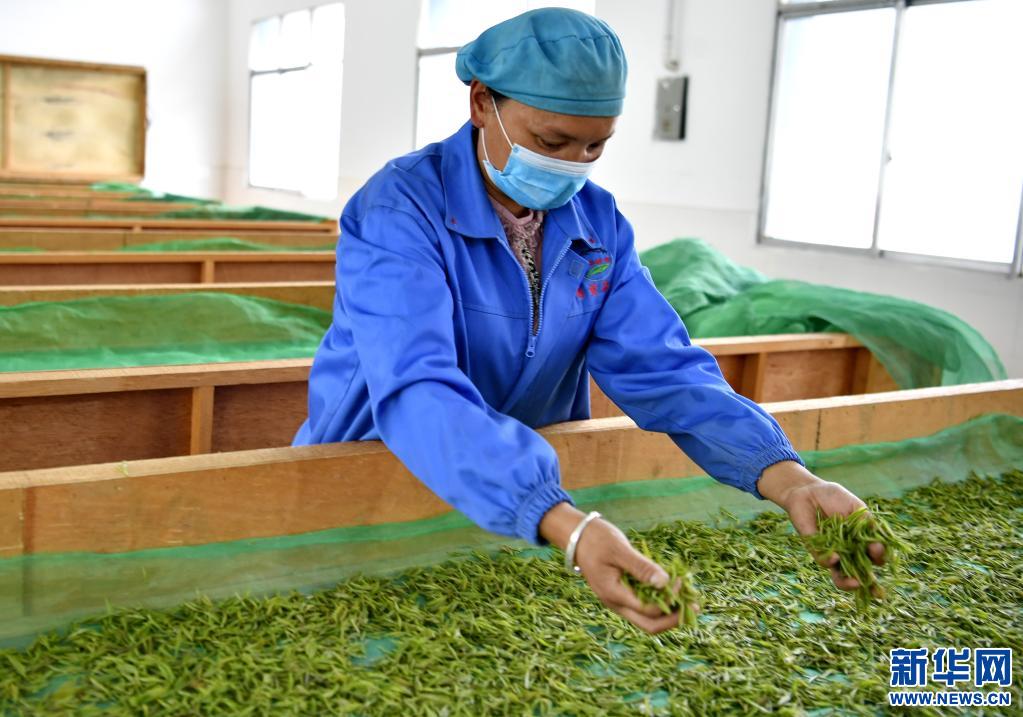 西藏易貢茶場(chǎng)加工車(chē)間的工人在進(jìn)行茶葉攤青(5月22日攝)。新華社記者 張汝鋒 攝
