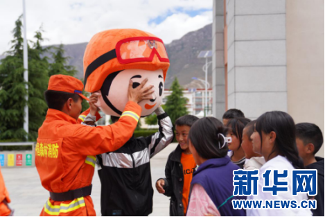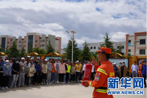 西藏森林消防總隊(duì)指戰(zhàn)員到西藏自治區(qū)兒童福利院教授孩子們使用滅火器(6月12日攝)。施福壽攝