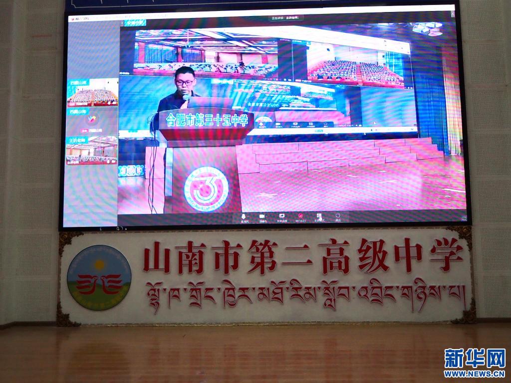 西藏山南市第二高級中學(xué)的學(xué)生坐在階梯教室中,屏幕的另一端是安徽省合肥市第三十五中學(xué)的同學(xué)們。借助網(wǎng)絡(luò)傳輸技術(shù),皖藏兩地實現(xiàn)思政課教學(xué)資源跨越上千公里的互聯(lián)共享,創(chuàng)新了思政課的形式。