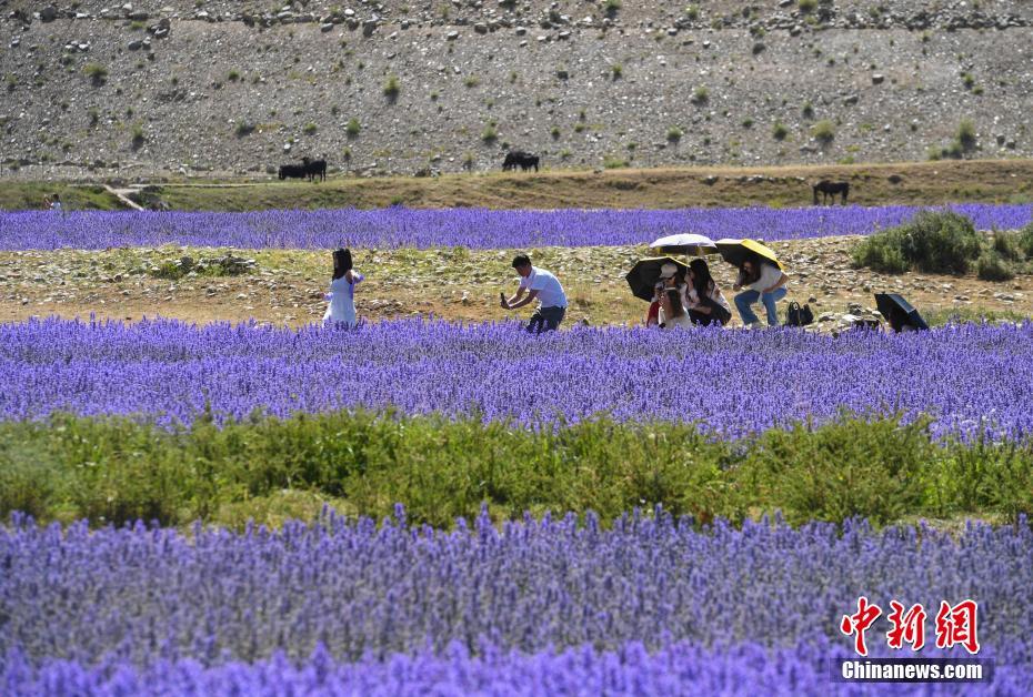 6月25日,位于西藏自治區(qū)拉薩市達(dá)孜區(qū)新倉村貝拉莊園的100畝薰衣草花海競相綻放,吸引不少游客和當(dāng)?shù)厥忻袂皝碛瓮妗⑴恼?。中新社記?貢嘎來松 攝