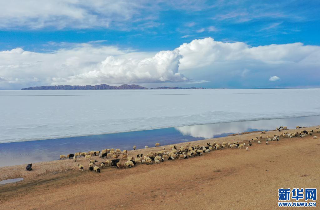 牧民指揮羊群從色林錯經(jīng)過(2020年4月29日無人機(jī)攝)。 新華社記者田金文 攝