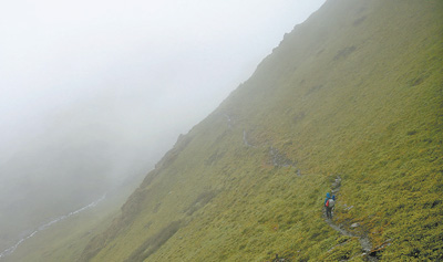 日子再苦,定期巡山是桑杰曲巴雷打不動的工作。一袋熟土豆,一把開山刀,就是巡山的全部裝備。白天,用刀劈開密不透風(fēng)的荊棘和灌木,在青苔泥濘的林間冒雨穿行;夜晚,在石縫樹洞里躲避野獸。餓了吃點土豆,渴了掬一捧溪水,累了靠在樹下休息。每次巡山前,桑杰曲巴總要叮囑姐妹倆,兩天就能回來,如果第三天還沒回來,趕緊出山去曲桑報信。巡山路上,桑杰曲巴檢查著自己以前楔下的木樁、掛上的國旗、刻下的文字。木樁如果被人拔掉了,他就重新楔上。國旗不見了,他就再次掛上。