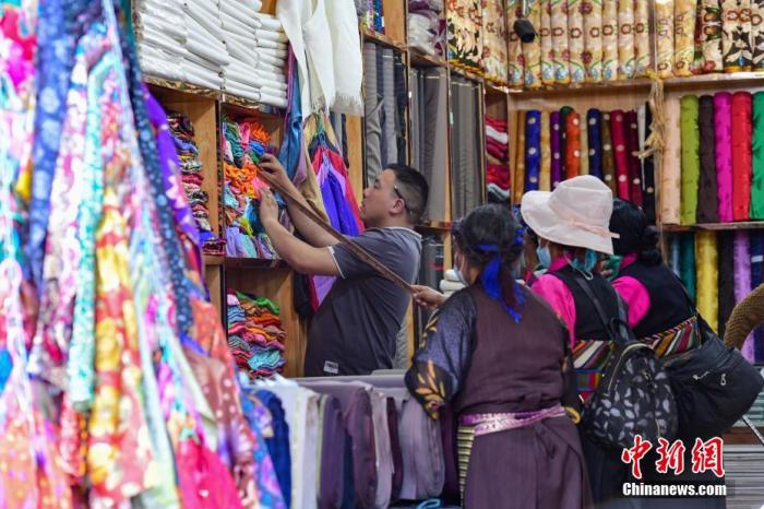 拉薩老城區(qū)的八廓街上,花樣繁多的藏裝店構(gòu)成一道絢爛民族風(fēng)。店中選購藏裝的顧客,既有本地人,也不乏口音各異的外地游客。22日下午,在此經(jīng)營藏裝店10余年的卓瑪迎來“特殊”的客人。