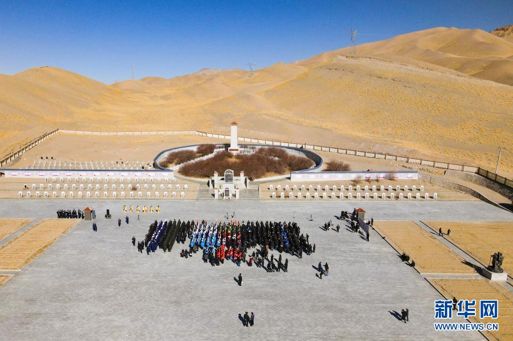 清明時節(jié),西藏阿里的黨員干部、解放軍、學(xué)生及群眾,聚集獅泉河烈士陵園,祭奠英靈(2021年4月4日攝,無人機(jī)照片)。新華社記者 張兆基 攝