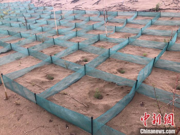 “傳統(tǒng)的方法是用廢樹枝等擺成方格等一定的形狀壓沙,里面再種上植物,效果很好但樹枝往往四五年就腐爛了;最近我們在嘗試推廣一種新型化學材料方格,成規(guī)模快,且能維持七到十年。”中國科學院西北生態(tài)資源研究院研究員常學向?qū)τ浾哒f。