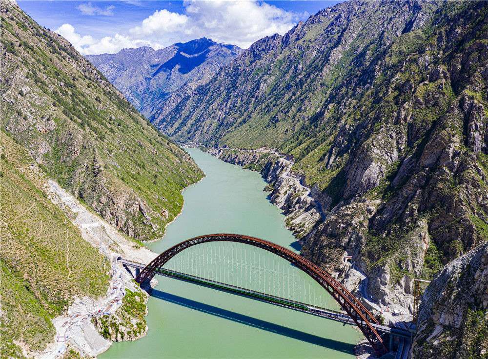6月17日,試運行的復興號列車行駛在川藏鐵路拉林段藏木特大橋(無人機照片)。新華社記者 普布扎西 攝
