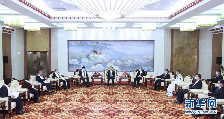 8月18日,以中共中央政治局常委、全國政協(xié)主席汪洋為團(tuán)長的中央代表團(tuán)飛抵拉薩,出席西藏和平解放70周年慶?;顒?dòng)。受黨中央和習(xí)近平總書記委托,汪洋在拉薩飯店看望在藏領(lǐng)導(dǎo)干部、老同志白瑪赤林、帕巴拉·格列朗杰和列確、巴桑,以及阿沛·阿旺晉美同志家人代表,向他們表示親切問候。新華社記者 劉彬 攝