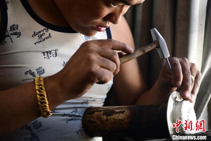 圖為工人正在鏨刻花紋。貢嘎來(lái)松 攝