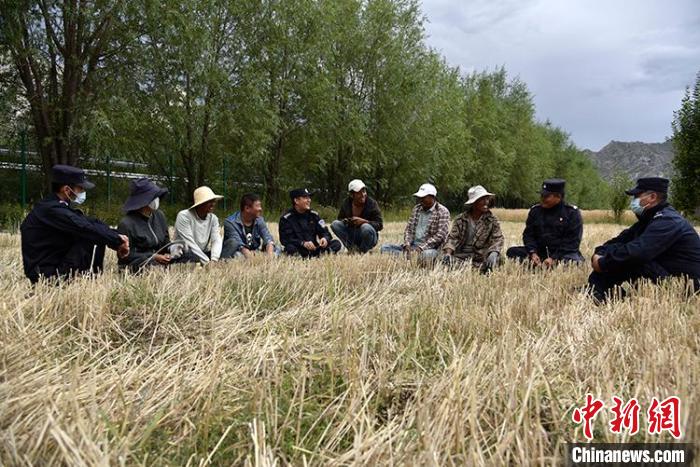 一陣忙碌過后,大家圍攏在田里聊變化說發(fā)展。慶祝西藏和平解放70周年大會剛剛舉行,大家聊著現(xiàn)場觀禮、收聽收看的感受。參加現(xiàn)場大會的民警高揚向大家分享現(xiàn)場感受,講述自己在西藏生活學(xué)習(xí)工作22年的發(fā)展變化和入警初心。歡聲笑語過后,大家又忙碌起來。田間地頭藏青藍的身影,與金黃麥地構(gòu)成一幅加強民族團結(jié)、警民魚水情深的動人畫卷。