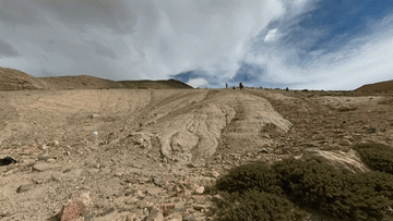 8月27日,科考隊員王昊(左)等人在西藏日喀則市定結縣區(qū)域內(nèi)考察一個垂直地面的沉積剖面。隊員們根據(jù)傾斜層理判斷,數(shù)萬年前這里是一個巨大的堰塞湖。新華社記者杜剛 攝