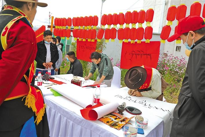 尼木縣書法愛好者揮毫潑墨寄托祝福。格桑倫珠 黃志武 攝