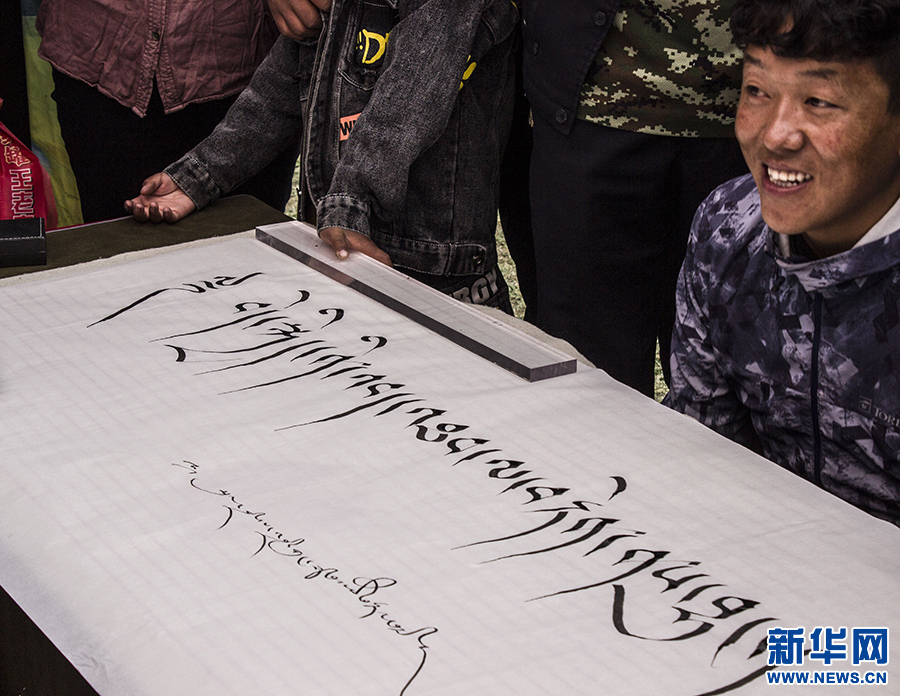 9月23日,群眾在活動(dòng)現(xiàn)場觀賞藏文書法。新華網(wǎng) 達(dá)次 攝
