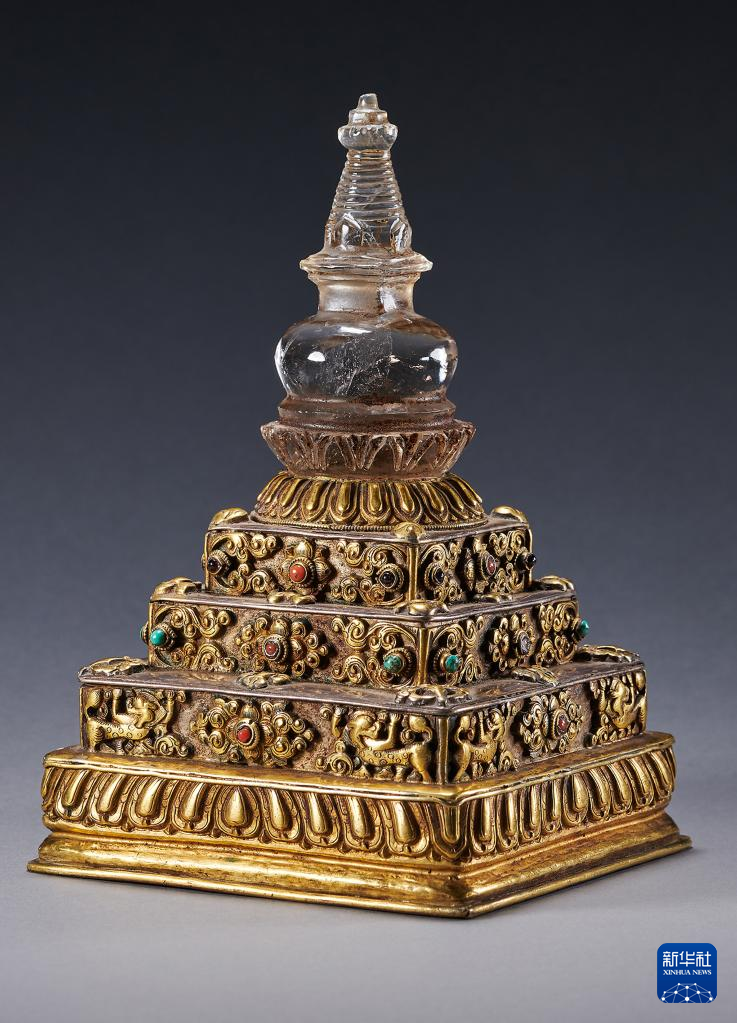 銅鎏金水晶嵌寶石供養(yǎng)塔(資料照片)。記者從9月26日召開的全國文物援藏工作電視電話會議上獲悉,國家文物局將從美國成功追索回國的12件文物藝術(shù)品整體劃撥西藏博物館。新華社發(fā)