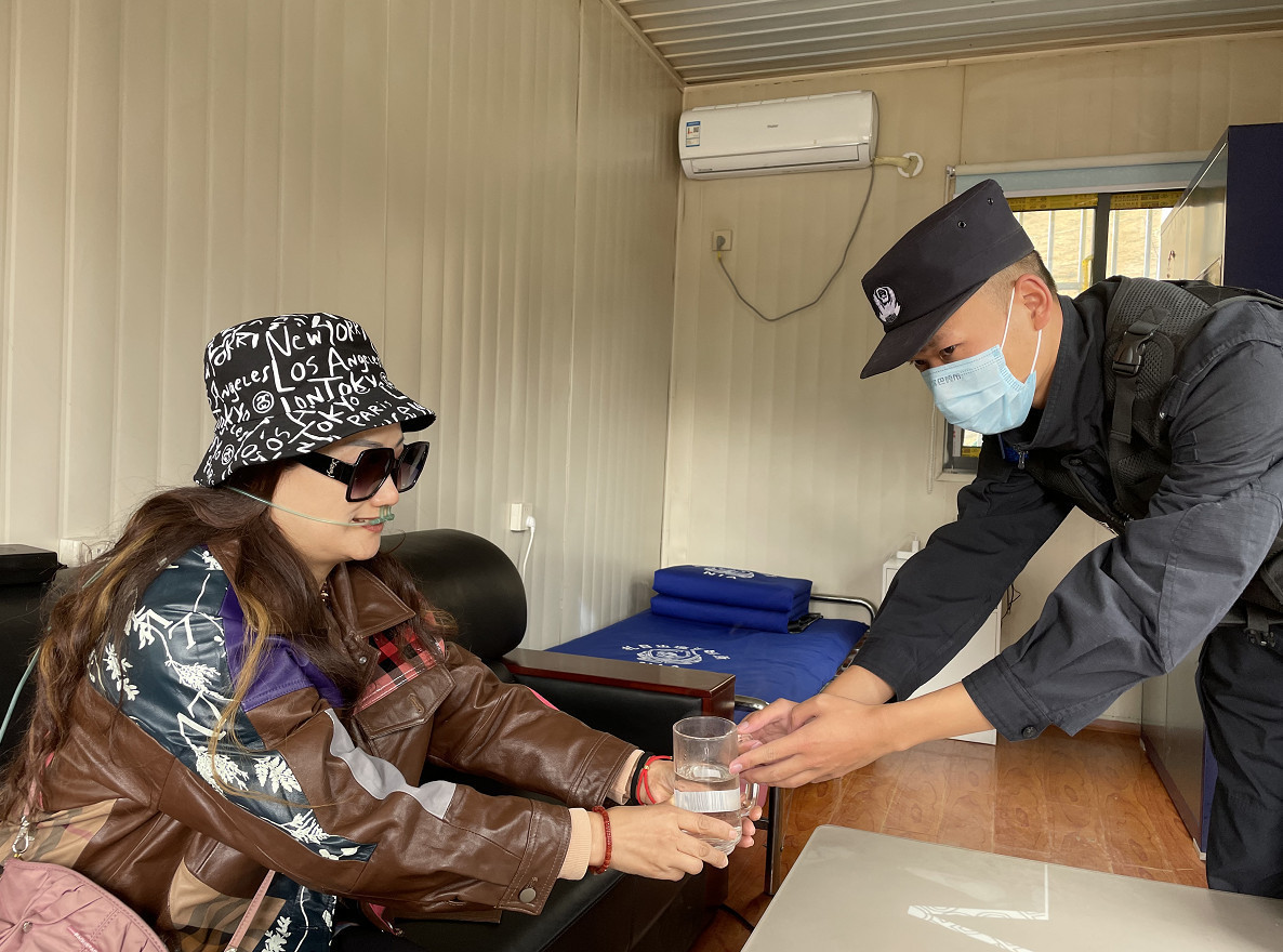 檢查站民警除了檢查出入邊境管理區(qū)人員和車輛以外,還設(shè)置了綠色便民服務(wù)區(qū),專門為長(zhǎng)途駕駛的游客提供飲用熱水和一些應(yīng)對(duì)高原反應(yīng)的藥品,以及為有吸氧需求的游客提供便攜式制氧機(jī)。據(jù)不完全統(tǒng)計(jì),自上點(diǎn)開展工作兩年以來,曲桑邊境檢查站共計(jì)為游客提供物資藥品幫助240余人次,幫助救援被困游客50余人,獲得了過往群眾游客的一致好評(píng)。