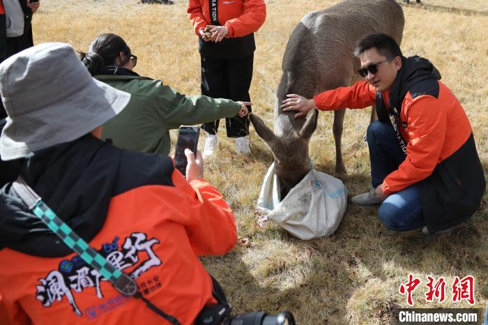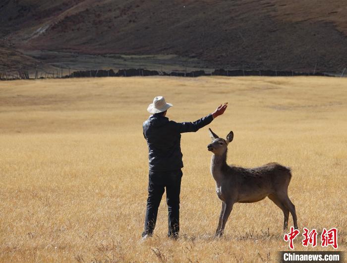 圖為西藏類烏齊馬鹿國家級自然保護(hù)區(qū)的管護(hù)員正在飼喂馬鹿。冉文娟 攝
