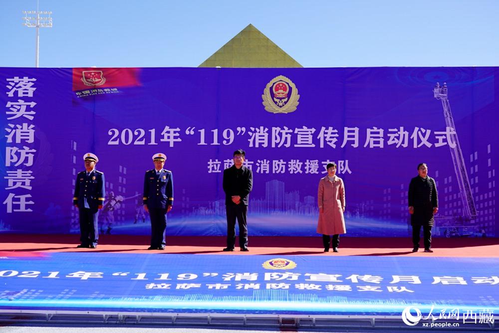 拉薩市2021年“119”消防宣傳月啟動(dòng)儀式現(xiàn)場(chǎng)。拉薩市委常委 、常務(wù)副市長(zhǎng)占堆(左三)出席儀式并講話(huà)。人民網(wǎng) 次仁羅布攝