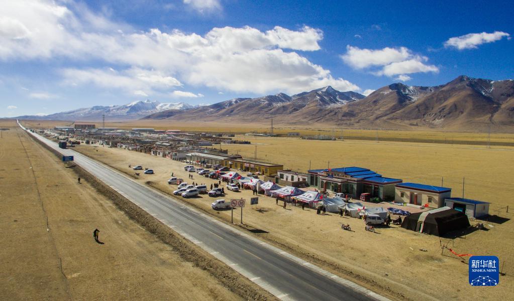 這是在青藏公路旁搭建的那曲縣香茂鄉(xiāng)畜產(chǎn)品展銷(xiāo)會(huì)(2017年11月25日攝,無(wú)人機(jī)照片)。新華社記者 劉東君 攝