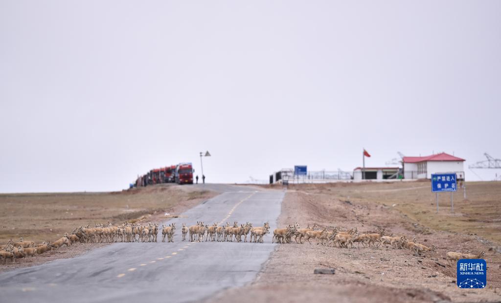 在青??煽晌骼?,一群雌性待產(chǎn)藏羚羊正在通過(guò)青藏公路(2016年6月7日攝)。新華社記者 吳剛 攝